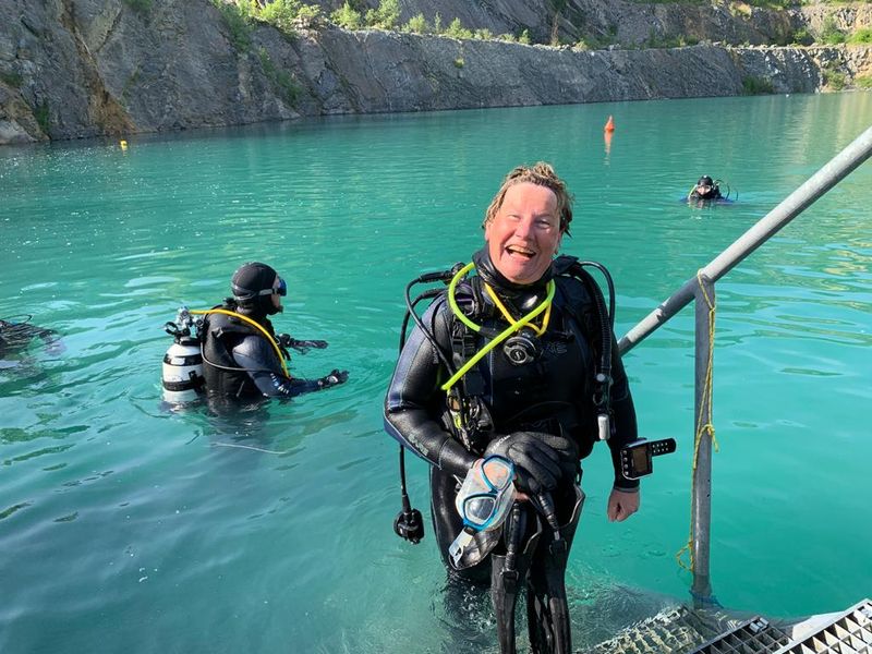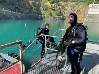 Die Termine für die Praxistauchgänge hatte ich  im Hunsfels schon lange vorhergebucht und das hat wieder perfekt geklappt. Viele kamen aus der Nähe und haben sich etwas früher freigenommen, um pünktlich um 15:00 Uhr am Steinbruch zu sein. Die Gruppen und Aufgaben (Boje setzten usw.) hatte ich vorher eingeteilt, sodass jeder in einer 3er Gruppe und in einer 4er Gruppe tauchen konnte und auch die Sicherung wurde entsprechend eingeteilt.