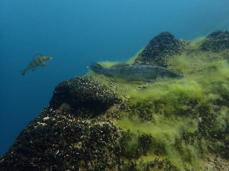 Beim zweiten Tauchgang zogen Kai und ich dann alleine los, ganz mutig auf die rechte Seite, wo man letzte Woche die Hand nicht vor Augen gesehen hatte. Und es war eine gute Entscheidung: Die Sicht war wieder ganz ordentlich und wir trafen die großen Flussbarsche, die diesmal nicht in ihrem Baum standen, sondern weiter hinten auf einer Algenwiese herumgammelten.