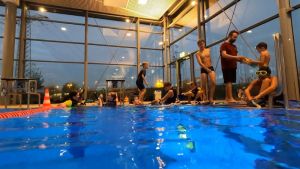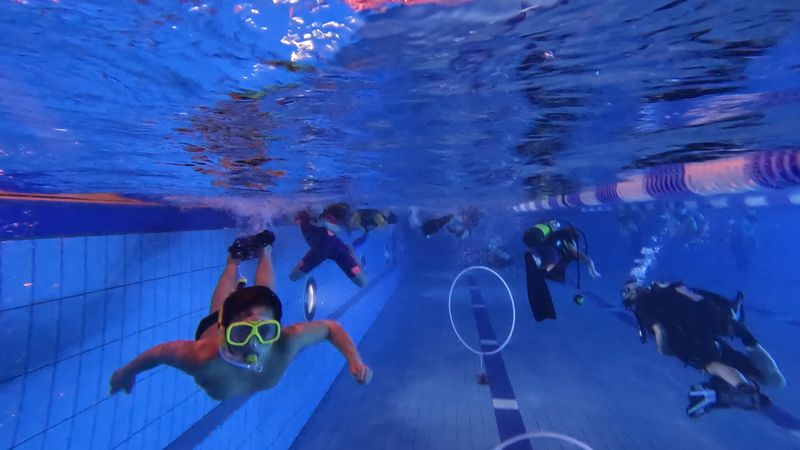 Selbstverständlich wurde im Zeichen der Energiekrise auch in der Rheinwelle die Wassertemperatur auf schnuckelige 25°C abgesenkt. Das klingt zwar erst mal ganz ok, aber tatsächlich ist das 12 Grad unter Körpertemperatur und gerade wenn man sich ruhig unter Wasser bewegt, wird einem ganz schön kalt und ohne Neopren ist man schnell durchgefroren. Aber da sich das bereits rumgesprochen hat, hatten einige ihre Neoprens dabei, die auch beim „normalen“ Training gerne getragen wurden.