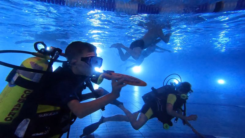 Es war schön, unter Wasser zu beobachten, wie sich die Neulinge „freitauchten“. Waren sie teilweise im Anfang noch recht unsicher, bewegten sie sich schon nach ein paar Minuten ganz natürlich im Wasser auf der Jagd nach dem Unterwasser-Torpedo. Nach 10 Minuten war dann Wechsel und als am Schluss niemand mehr tauchen wollte, weil fast alle durch das kalte Wasser schon ausgekühlt waren, durfte Micah noch eine zweite Runde tauchen, weil es ihm so viel Spaß gemacht hatte.