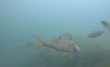 Obwohl die Sicht in beiden Seen zur Zeit eher bescheiden ist, wimmelt es von Fischen. Im Marxweiher haben wir außer Schwärmen von Flußbarschen, Sonnenbarschen und Rotfedern auch Hechte, Aale, Schleien und sehr neugierige Haubentaucher gesehen. Letztere waren aber definitiv zu schnell für mich, deshalb gibt es davon keine Bilder.