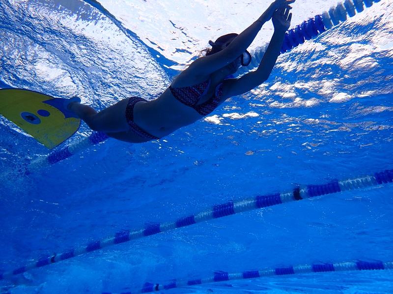Das Becken der Rheinwelle ist schon groß, aber wenn 15 Taucher gleichzeitig und möglichst noch im „tiefen“ Bereich tauchen, wird es schon manchmal kuschelig. Nachdem die Oberflächen-Flossenschwimmer fleißig Konditions- und Koordinationsübungen gemacht und die Mono-Flosse ausprobiert hatten, wurde gewechselt.