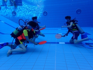Zuerst bauten die Gruppen gemeinsam mit fachkundiger Unterstützung von Yasmine, Kerstin, Georg, Christoph und Kai die Ausrüstungen zusammen. Alle waren aufmerksam bei der Sache und gespannt auf ihren ersten Tauchgang. Damit es unter Wasser nicht langweilig wurde, standen Ringe zum Durchtauchen, UW-Frisbee , UW-Tennis, Kegelbretter und ein UW-Torpedo zur Verfügung.