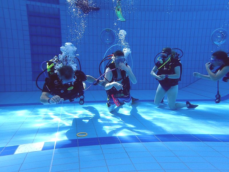 Es ist immer wieder verblüffend zuzuschauen, wie problemlos das Tauchen für Kinder und Jugendliche ist. Schon nach kurzer Zeit hatte man gar nicht mehr den Eindruck, dass die meisten da gerade ihren allerersten Tauchgang machten. Und unter Wasser war es voll. Es konnte nicht das komplette Schwimmerbecken genutzt werden, weil natürlich noch andere Gruppen das Schwimmbad nutzten, aber jeder konnte einen ausführlichen Tauchgang machen und nachmittags fuhren Kai und Georg zum Kompressor und füllten die ganzen Flaschen wieder für den nächsten Tag.
