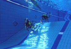 Am Mittwoch durften auch wieder alle mit Gerät tauchen. Der Ablauf war schon Routine: Erst wurde der Bulli ausgeladen und dann fand sich jeder bei seinem „Ausbilder“ wieder ein (soweit die gleichen Leute wieder da waren, es gab da natürlich auch den einen oder anderen Wechsel), montierte das Gerät und schon ging es wieder ab ins Wasser. Dort unten war der reinste Spielplatz eingerichtet mit Ringen, Kegelbrettern, Unterwasser-Tennis, UW-Frisbee und Torpedos. Die einzelnen Grüppchen tauchten los und unten traf man sich dann zum Spielen mit immer anderen Spielgeräten und in immer neuen Kombinationen. Langweilig wurde es nicht. Viel zu schnell kam der Zeitpunkt für den Wechsel. Die andere Gruppe, die bis dahin mit Ines und Alex Flossenschwimmen und Apnoe gemacht hatte, durfte jetzt mit Gerät tauchen. Das Ende wurde von den Druckluftflaschen diktiert, denn irgendwann war die Luft alle. Während die Gerätetaucher ihre Ausrüstung auseinanderbauten und versorgten, tauchten die Flossenschwimmer durch das Becken und sammelten die Spielsachen wieder ein. Danach mussten alle wieder mit anpacken und das ganze Material nach draußen schleppen, wo es unter Anleitung von Kai wieder in den Bulli geladen wurde.