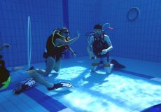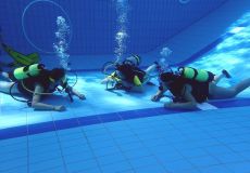 Am Dienstag ging es dann endlich ins Wasser, aber vorher musste das ganze Material, das Kai in seinen Bulli geladen hatte, ausgeladen und in die Schwimmhalle getragen werden. Dann wurde auch die Leihausrüstung (Maske und Flossen vom Verein) ausgegeben und die Jackets und Atemregler kombiniert und geschaut, wem welches Jacket passt. Jeder musste sich dann merken, welche Größe er braucht. Dann wurde die ganze Mannschaft in zwei Gruppen eingeteilt. Während die erste Gruppe mit Ines in ABC-Ausrüstung trainierte, wurde die zweite Gruppe auf die Trainer und TLs aufgeteilt. Diese bauten mit den Schülern die Ausrüstung zusammen und machten nochmal ein Briefing, bevor sie dann abtauchten.